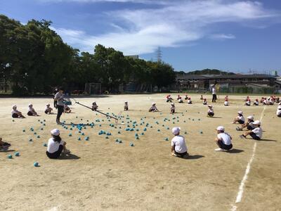 運動場を見ると、低学年が玉入れの練習をしていました。ん?玉入れだけじゃなく、かわいいダンスも?