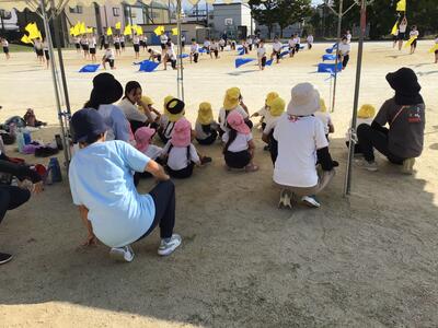・本日は高学年の演技の様子を道明寺南幼稚園の園児の皆さんが見学に来てくれました。本校の高学年の児童はそろそろ仕上げの時期。今週、☔模様のようですが、それも寄せ付けないような熱い演技で、園児を魅了していました。