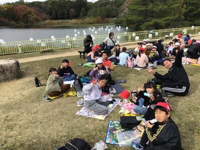 公園に到着後は、グループでのオリエンテーリングです。5つのポイントにあるミッションをクリアしながら、1時間ほど園内をまわりました。そして、楽しみのお弁当タイムです。お家の方、朝早くからのお弁当作り、ありがとうございました。