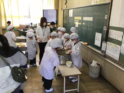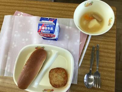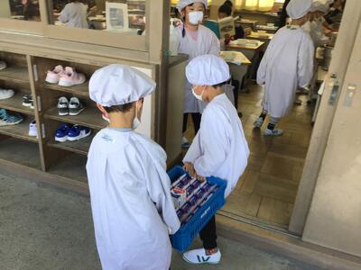 1年生の給食が、17日金曜日からスタートしました。今日は、2回目の給食。まだ準備に慣れていないため、ほかの学年よりも少し早く配膳スタート。パンや牛乳は、同じ階の給食室から自分たちで運んで、盛り付けも、自分たちで行います。盛り付け量の調整や、牛乳パックのストローの使い方なども、先生から丁寧に教わりました。係の人や、先生が準備をしている間も、自分の席で、静かに待っていて、とても素晴らしい!!!「いただきます!」のあとは、みんなでおいしくいただきました。今日は、隣の幼稚園の先生方も見に来てくださっていて、「みんなおりこうさんね~!」と喜んでおられました。まだまだ配膳準備に慣れるまでに時間がかかると思いますが、すぐに手際よくできるようになりますよ!